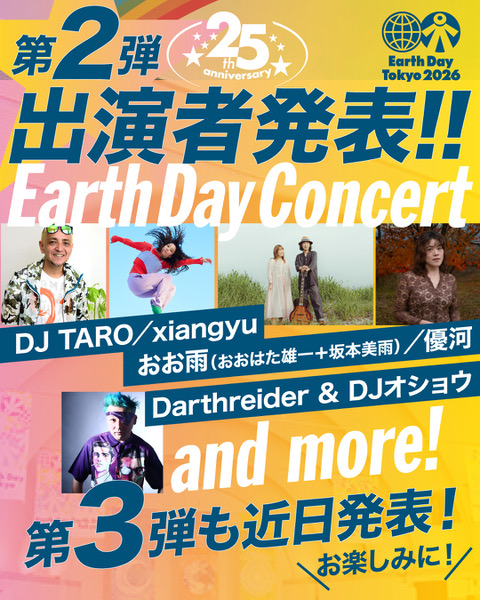 4月18日(土)、19日(日)に開催される、日本最大級の市民フェスティバル「アースデイ東京2026」への出演が決定いたしました。入場無料のイベントとなりますので、皆様ぜひお立ち寄りください。※出演日は後日発表となります。オフィシャルサイト第2弾出演者